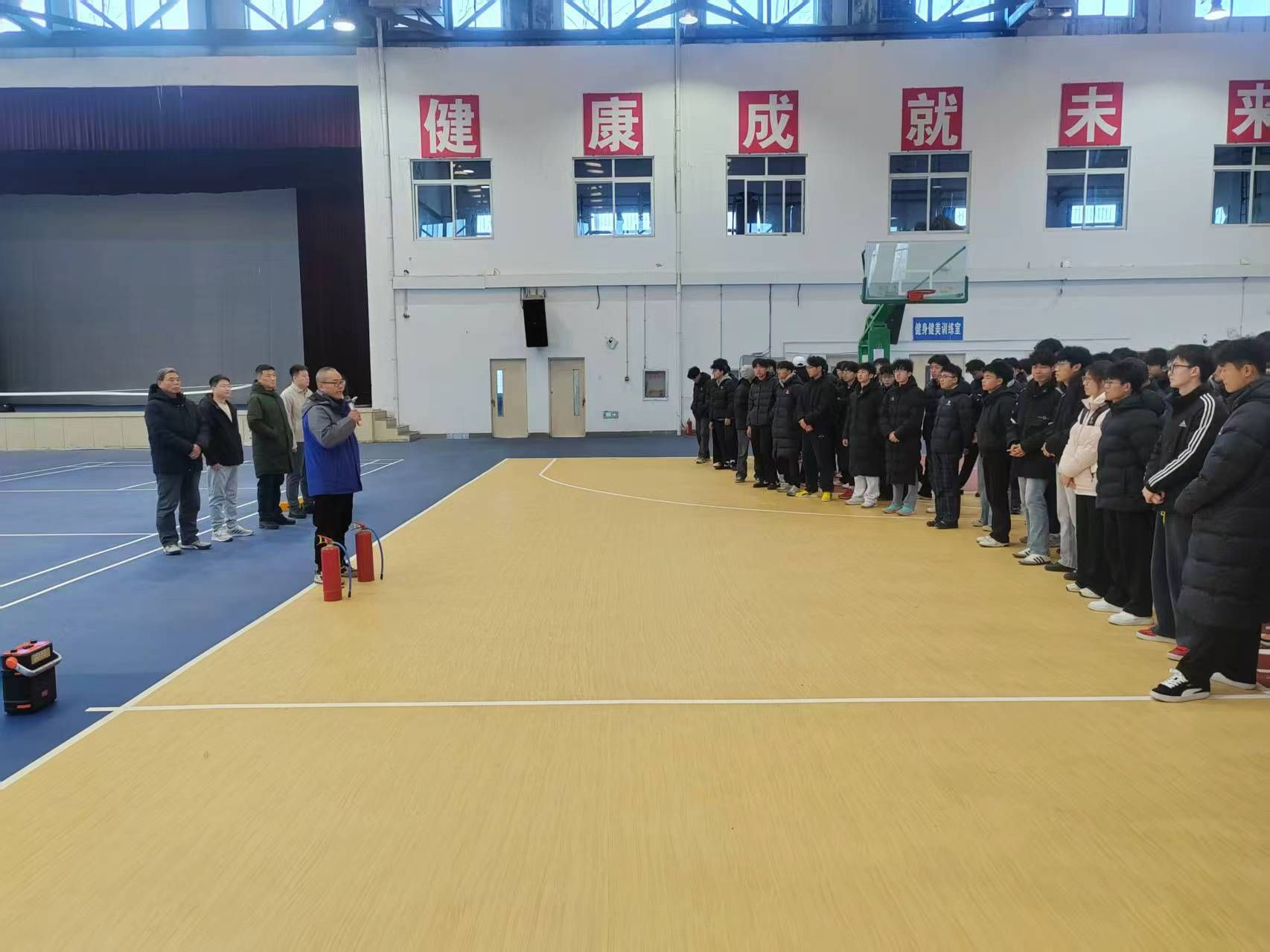 为切实增强师生消防安全意识,提升突发事件应急处置实战能力,筑牢校园安全屏障,12月26日中午,体育学院联合学校安全管理处在学校体育馆开展消防安全应急演练。学校消防维保公司工程师吴百新,学校安全管理处刘福祥老师、宋凯老师,体育学院党委副书记胡颖杰,体育学院团总支老师以及学院全体在校生参加应急演练活动。