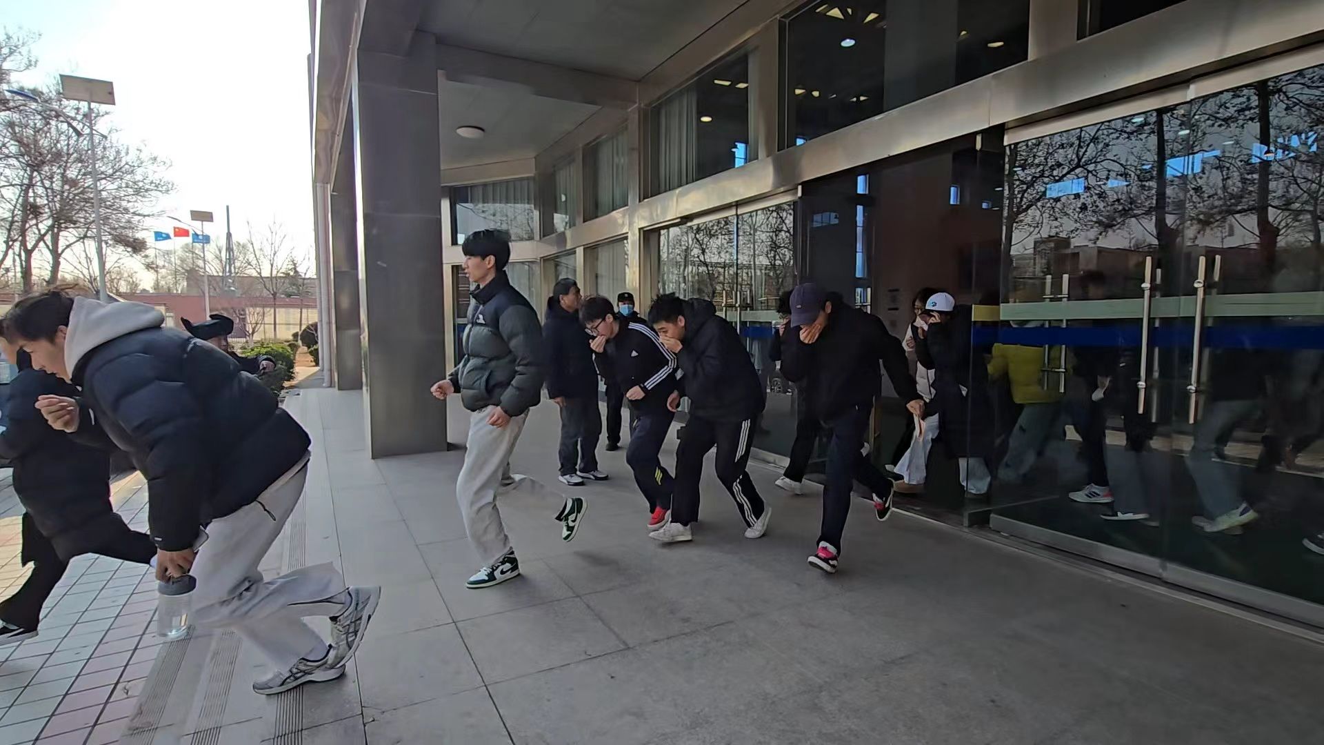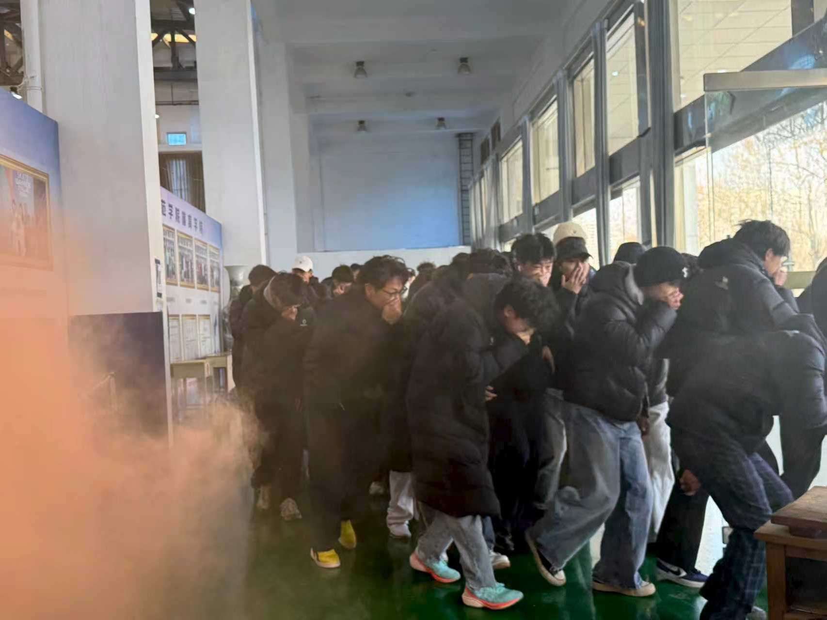 演练于12:30正式开始,体育馆内迅速模拟起火,烟雾弥漫,警报骤响,参加演练的师生迅速进入应急状态,在统一指挥下,师生立即按照“低姿弯腰、捂住口鼻、快速撤离”的疏散要领,沿最近路线经安全出口,迅速有序地撤离至体育馆外安全集合点。整个逃生过程组织严密、行动高效、配合顺畅。