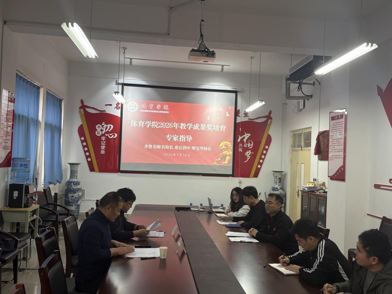 为凝练教学改革成果,提升教学成果奖申报质量,明确培育方向与攻坚路径,2026年1月16 日,齐鲁师范学院体育学院召开2026年教学成果奖培育专家指导会。聊城大学张永虎教授,章丘四中纪委书记、初中部党总支书记、章丘区东城实验学校党支部书记明宝华校长受邀莅临指导,体育学院副院长贾磊出席会议并讲话,刘多、李娜等骨干教师参会。