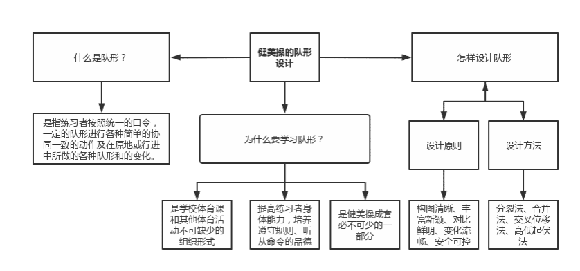 教学重点:明确健美操队形设计的构图清晰、丰富新颖、对比鲜明、变化流畅、安全可控五大基本原则,学会使用分裂法、合并法、交叉位移法、高低起伏法四大变化方法,掌握队形变化的“NICE”原则。