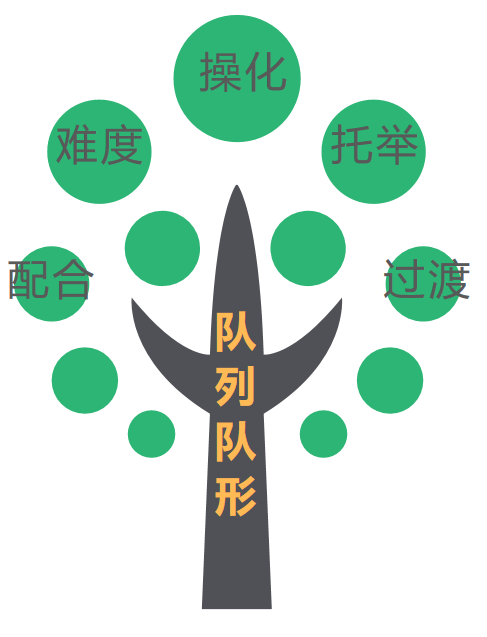 假如说操化动作、难度动作、过渡链接动作、技巧动作、托举与配合动作像是大树上结下的饱满果实,那队形的变化就像是无数粗壮的树枝,它将颗颗果实有机的结合起来,是健美操成套必不可少的一部分。是评判运动员专业水平中的重要内容,是体现健美操艺术性、技巧水平、独特风格与创意的亮点部分。