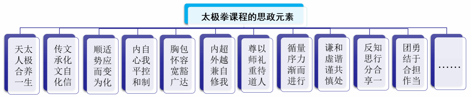 “课程承载思政,思政寓于课程”。2020年5月教育部印发《高等学校课程思政建设指导纲要》(以下简称《指导纲要》)的通知中提出,公共基础课程设计要注重在潜移默化中坚定学生理想信念、厚植爱国主义情怀、加强品德修养、增长知识见识、培养奋斗精神,提升学生综合素质。打造一批有特色的体育、美育类课程,帮助学生在体育锻炼中享受乐趣、增强体质、健全人格、锤炼意志[2]。太极拳运动承载着中华传统优秀文化精髓,蕴含着丰富的“立德树人”思政资源,深入挖掘提取其中的思政元素是该课程思政教育的基本要求和前提。太极拳课程中的思政元素如下: