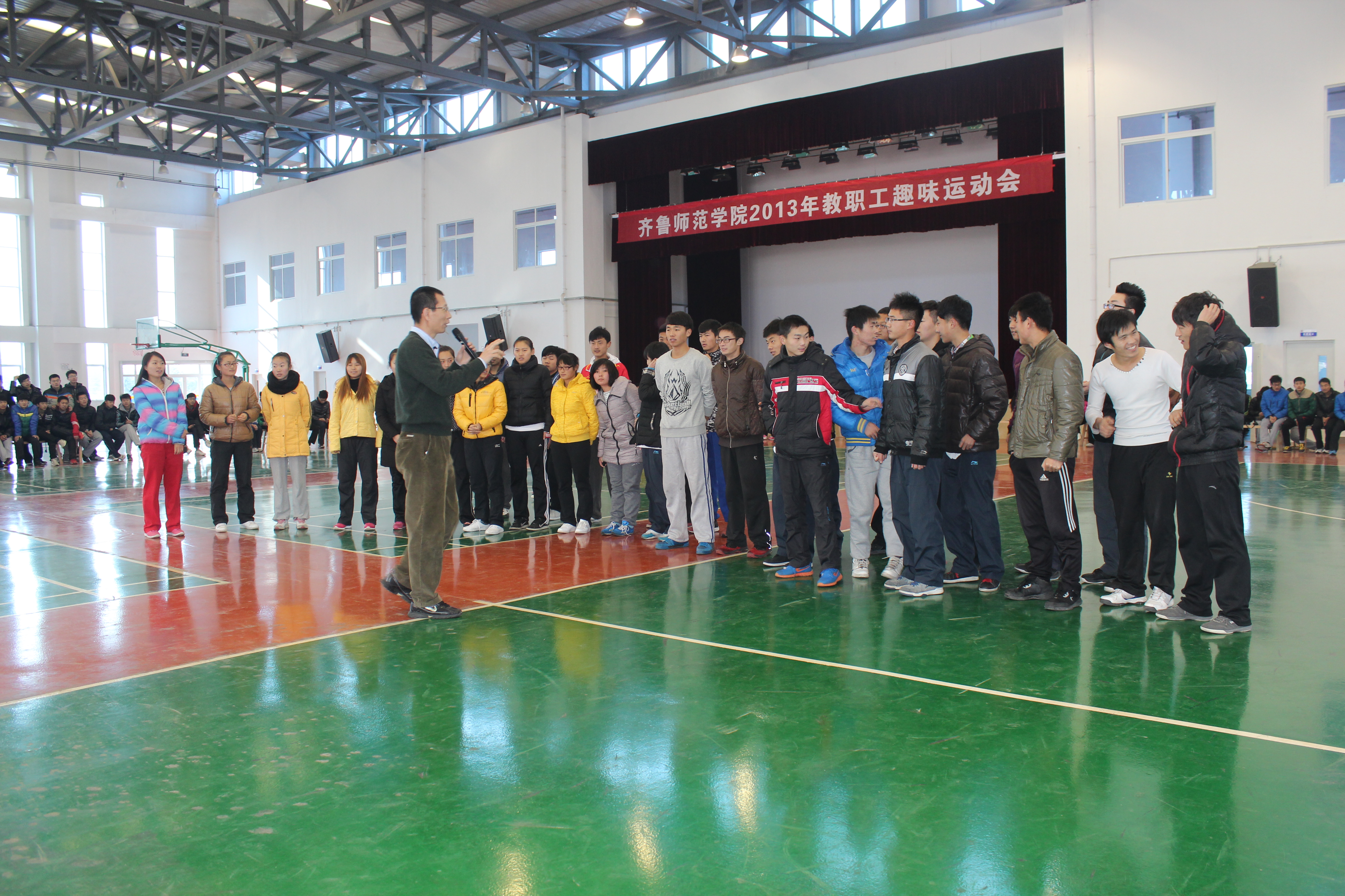 10:00,体育学院全体师生500人在体育馆围坐在篮球场四周,路春雷博士亲自组织体育教学公开课,利用简单的场地、器材,面对毫无准备的同学,他完全采用在布鲁克大学开展的教学形式,通过现场调度、培训、组织、裁判、采访等方式,让200多名学生参与体验了4项体育活动。在两个小时的教学展演中,路博士注重调动学生的主动性,高频率地使用访谈、启发,形成了很好的教学互动氛围;注重学生的主管体验,让学生通过中小强度的身体练习,感悟协作配合的技巧,强化团队精神;注重体育规则的实用价值,因地制宜调整规则,让学生感到只要努力,就会达到目标,收获成功体验,有效激发了参与体育活动的热情;注重体育活动的安全距离,让学生身体“零碰撞”,避免伤害发生。同学们一致反映,这种组织形式的体育课、这么热烈的课堂氛围一定受欢迎,值得我们学习推广。