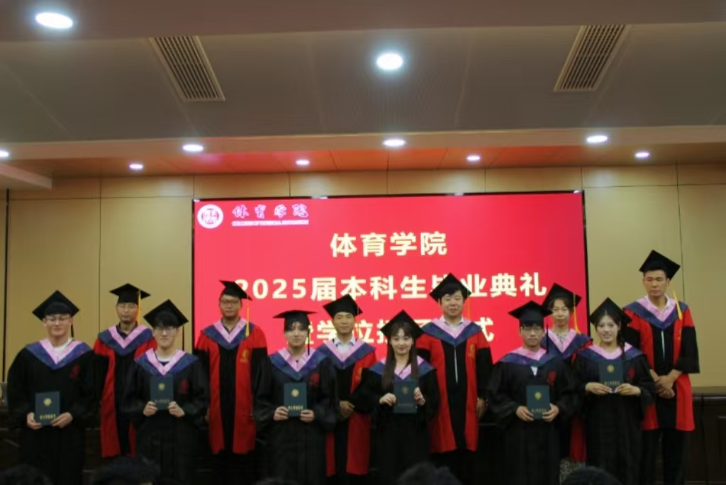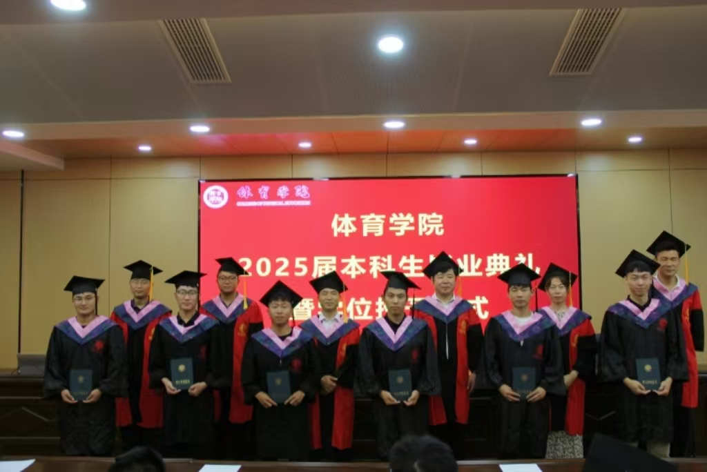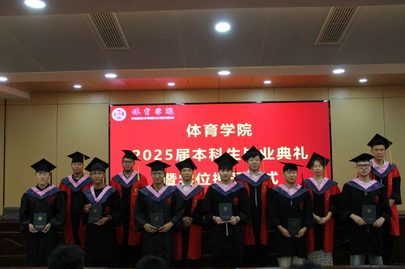 大道如砥,行者无疆。体育学院本科毕业生们昂首阔步,庄严走向主席台,学院学术委员会委员为他们逐一拨穗正冠,颁授学位证书,并亲切合影留念。