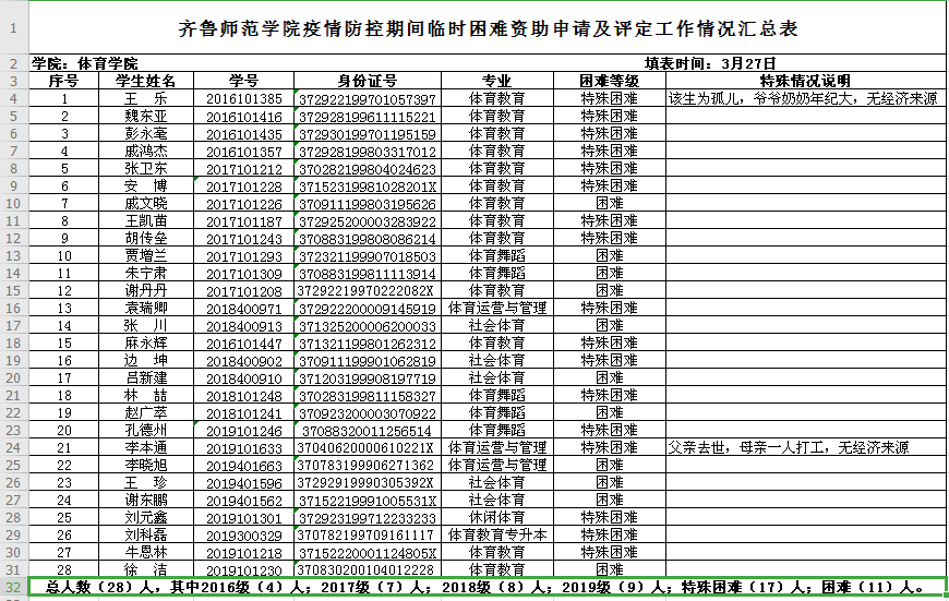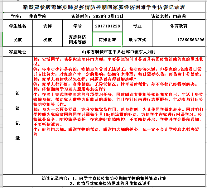 体育学院要高度重视新型冠状病毒感染肺炎疫情防控期间学生资助工作,精确了解家庭经济困难学生真实情况,全面开展拉网式排查工作,利用电话、网络等形式开展了解慰问工作,此次申请及评定工作必须严格掌握标准、严格规范程序,做到精准资助,并将过程性资料建档留存。