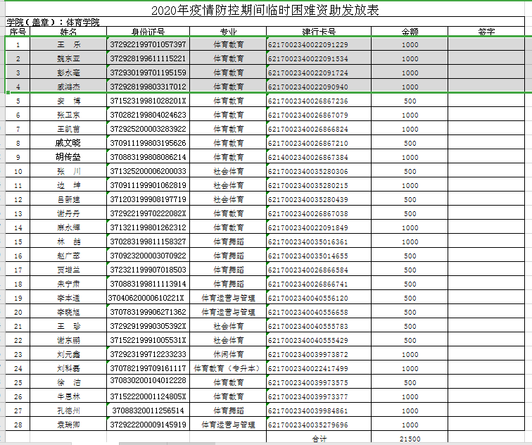 2020年3月,新型冠状病毒肆意蔓延,学校非常重视疫情下家庭受困学生,下发《关于做好新型冠状病毒感染肺炎疫情防控期间学生资助工作的通知》(学工部函〔2020〕4号)要求,为切实保障家庭经济困难学生基本生活需求,帮助因疫情影响导致经济困难的学生及其家庭渡过难关,学校启动疫情防控期间临时困难资助。