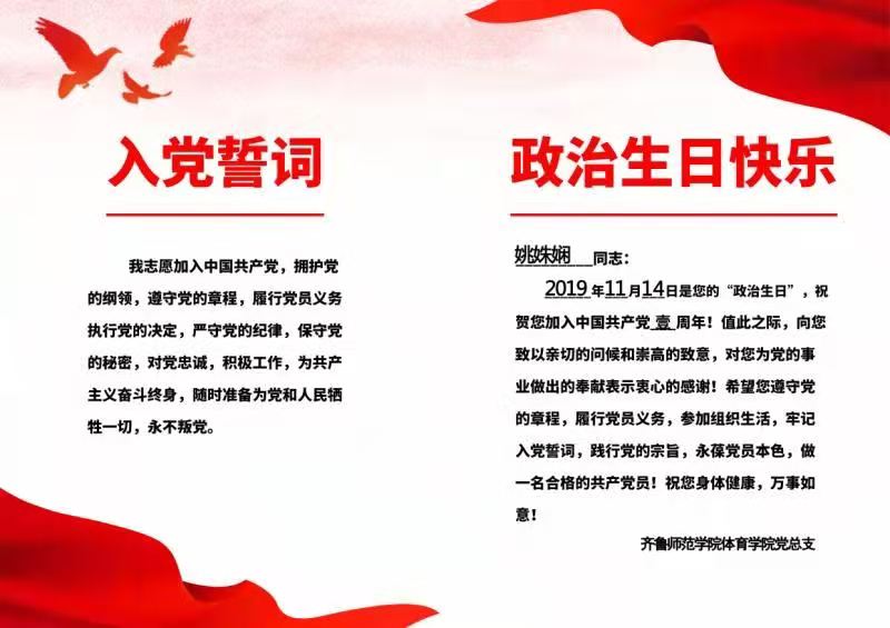11月16日下午,在体育学院党员活动室,学生党支部在党员转正后,随即为他们送上“生日祝福”。学生党员郭奎林、姚姝娴、杨柳等人,分别接到了党支部书记闫莉莉送来的“政治生日贺卡”。一张小小的卡片,饱含着党组织的温暖关怀,勉励他们时刻铭记共产党员“第一身份”,牢记新时代大学生党员的职责担当,以实际行动守初心、扬青春,担使命、当先锋。