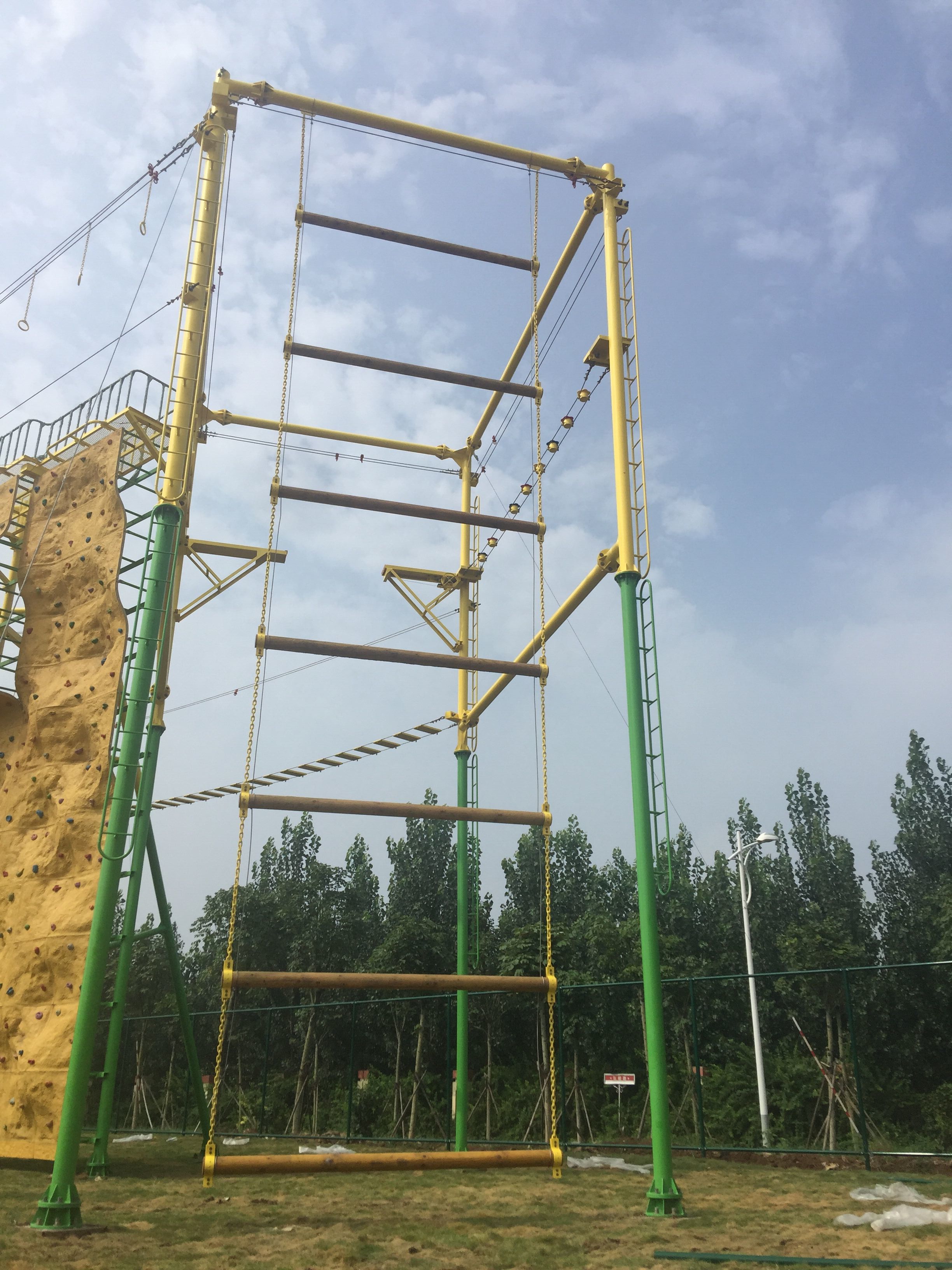 投资近150万元的拓展基地占地4100多平米,主要项目包括5个部分,有12米高的“攀岩”等12个高空心理行为训练器械;有高标准的“毕业墙”;有“信任背摔”等半高空项目专业训练器;有空中走廊(WETOP)大型双层组合训练平台,空中走廊包含了缅甸桥、横吊桩桥、钻网筒、吊桩桥、U型绳网、秋千桥、吊板台桥、绳桥、空中运输、吊板桥、斜板桥、单板桥、悬崖峭壁、牵引吊环、侧爬网绳、抱桩、牵引绳桥等两层共17个训练项目;有地面心智类项目20多项。同时还配备了动力绳、钢锁、全身安全带、安全帽等全套专业户外素质拓展器材,可开展60多项活动,每年可服务2万人次专业训练。据专家介绍,这套设施是目前山东省高校当中最为先进完善的户外教育拓展基地。