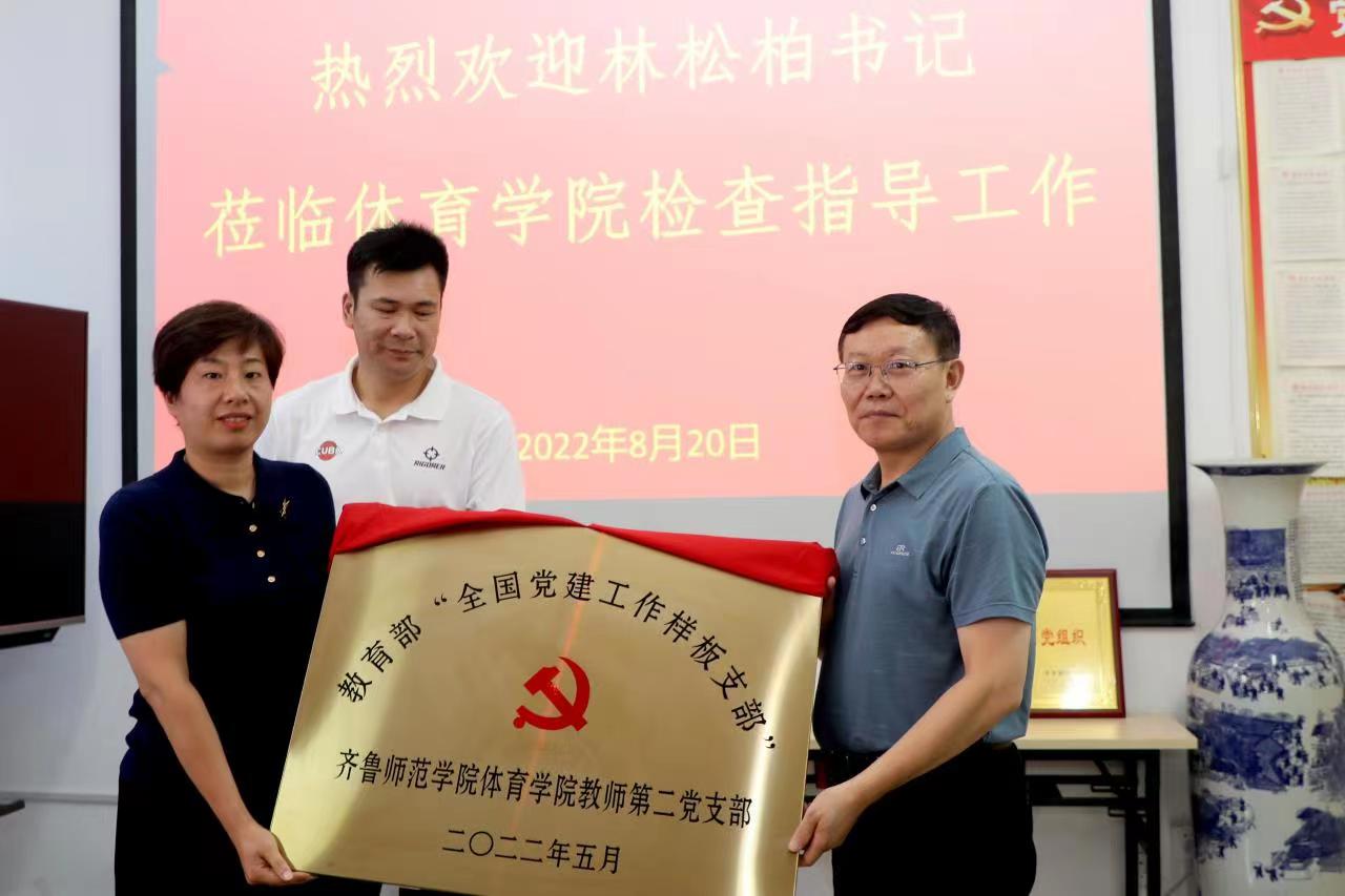 林松柏为体育学院教师第二党支部荣获“全国党建工作样板支部”进行授牌。根据教育部关于开展第二批新时代高校党建示范创建和质量创优工作、开展首批高校“双带头人”教师党支部书记工作室建设工作的通知安排,2022年5月底,教育部思想政治工作司公布了第二批新时代高校党建示范创建和质量创优工作验收结果,我校体育学院教师第二党支部顺利通过此次验收,成为“全国党建工作样板支部”。体育学院教师第二党支部坚持贯彻创建思路,强化组织引领,优化队伍建设,紧紧围绕实现“七个有力”的创建目标,做到加强政治建设,党员教育有力;严守规章制度,党员管理有力;加强党性锤炼,党员监督有力;牢记使命,组织有力;树立榜样,宣传有力;思想引领,凝聚有力;有效融合,服务有力。结合样板支部创建的实际情况,加强支部创建的机制创新、实践创新及方法创新,提出“两个一”的发展目标,形成“七个坚持”的工作思路,实施“党建+”工程,打造育人载体,选树模范典型,着力创建支部党建工作品牌,努力把党支部建设成为新时代的坚强战斗堡垒,充分发挥了示范引领作用。