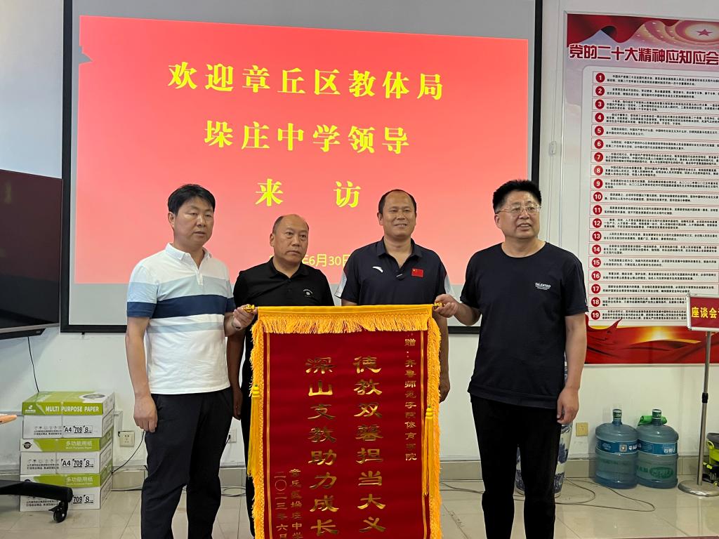 6月30日下午,章丘区教体局总督学高永新将一面书有“德教双馨担当大义 深山支教助力成长”的锦旗送到齐鲁师范学院体育学院,感谢体育学院全体师生对垛庄中学的定点帮扶支教。齐鲁师范学院体育学院院长马涛、党委副书记胡颖杰、副教授卞守新,垛庄中学校长赵玉明参加活动。