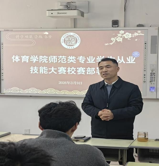 为夯实体育师范生教学基本功,提升教育实践能力与就业竞争力,全力备战师范类学生从业技能大赛,2026年3月9日,体育学院在1教B123教室召开师范类专业学生从业技能大赛校赛部署会。体育学院副院长贾磊、体育教育专业负责人刘飞、指导教师李娜等老师和2023级体育教育学生参加会议。