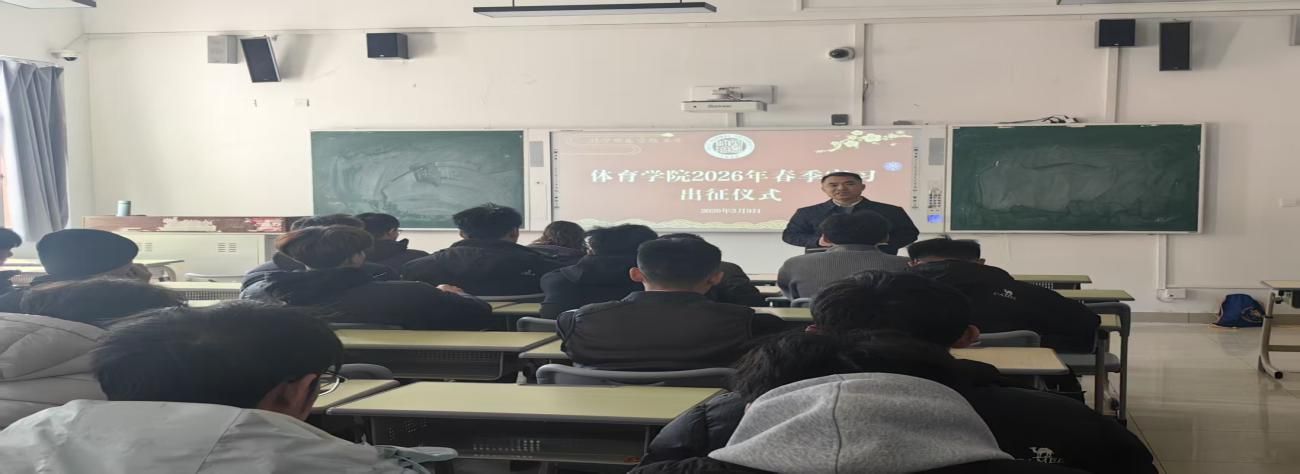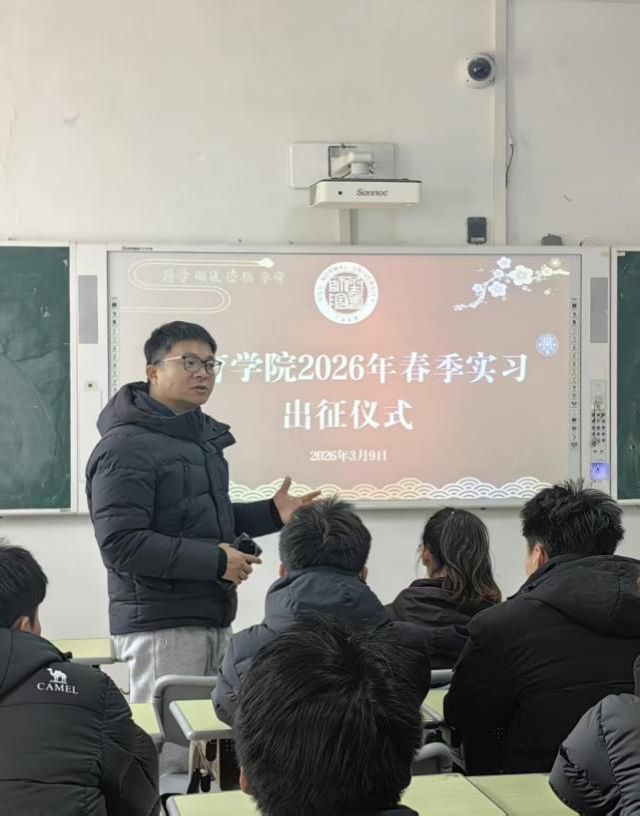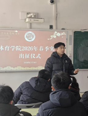 春风送暖,实践启新。为深化实践育人,推动专业理论与教学训练深度融合,体育学院2026年春季实习近日全面启动。3月9日,实习出征仪式在一号教学楼B123教室举行,体育学院副院长贾磊、体育教育专业负责人刘飞老师、教学秘书李娜老师、实习指导教师李泽阳等老师和全体实习生参加仪式。现场气氛热烈,全院学子即将奔赴各优质实习基地,开启以师为镜、躬身笃行的成长之旅。