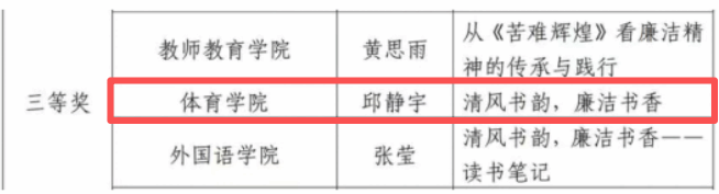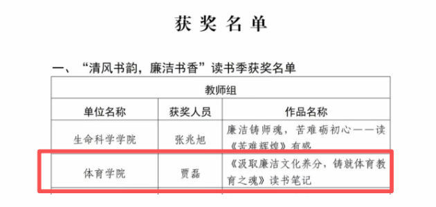 在“清风书韵,廉洁书香”读书季评选中,贾磊老师凭借作品《汲取廉洁文化养分,铸就体育教育之魂》读书笔记荣获教师组奖项。