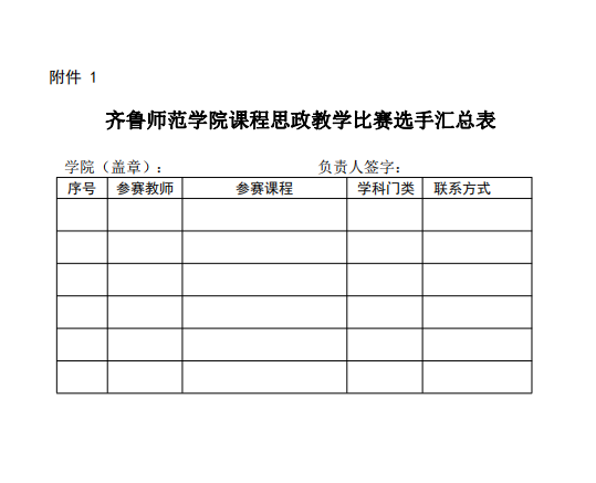 1.5月31日前,请各学院将《齐鲁师范学院课程思政教学比赛选手汇总表》(附件1)发送至邮箱 qlnujx@163.com,邮件主题为“学院+课程思政教学比赛选手汇总表”,纸质版汇总表由学院签字盖章后报送至教务处(2教B408)。