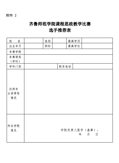 2.6月7日前,以学院为单位将参加校级决赛教师的《齐鲁师范学院课程思政教学比赛选手推荐表》(附件2)以及参赛材料发送至邮箱 qlnujx@163.com,邮件主题为“学院+课程思政教学比赛选手推荐表及参赛材料”