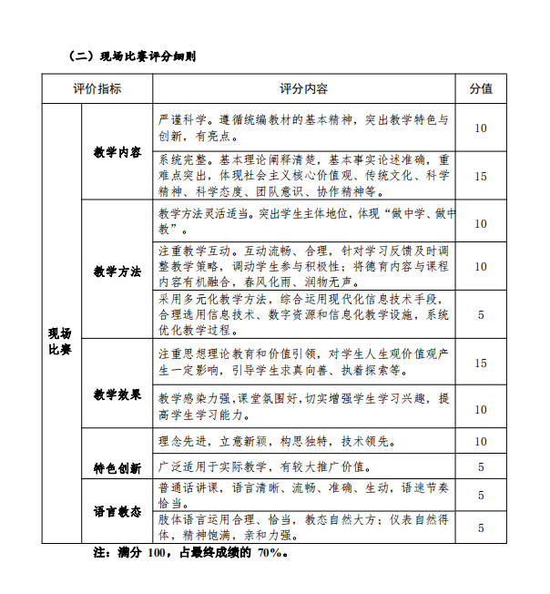 决赛具体程序另行通知。参赛教师从决赛自报的3个教学节段中,抽签选取1个讲授20分钟,评审专家现场打分(打分标准见附件3)。选手的最终成绩,由教学设计成绩(占30%)以及现场教学演示成绩(占70%)综合确定。