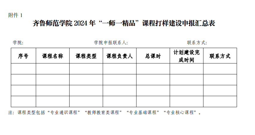 1.各学院要高度重视遴选工作,认真组织课程积极申报,并择优推荐,填写《齐鲁师范学院 2024年“一师一精品”课程打样建设申报汇总表》(附件1)。