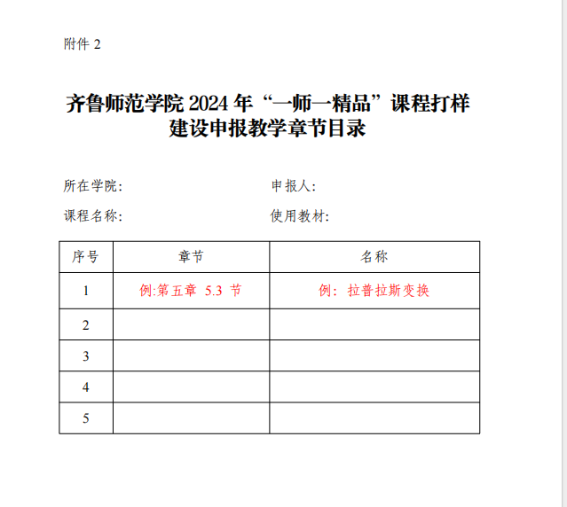 2.各课程负责人填写《齐鲁师范学院 2024 年“一师一精品”课程打样建设申报教学章节目录》(附件2),填报5节课程,同时提交所填5节课程的教学设计与教学课件,以学院为单位报送教务处。