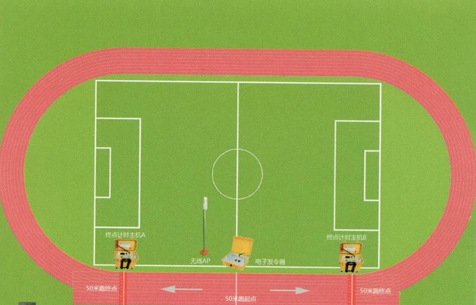 3.学生进入50米起跑点,裁判老师使用发令主机进行发令,发令主机发出“各就位、预备、砰”的枪响后,学生按照发出的指令进行起跑。当通过正前方红色地毯时,会听到“滴”声,终点计时主机自动停止计时并记录考试成绩。(抢跑学生必须召回,否则会出现错误成绩)