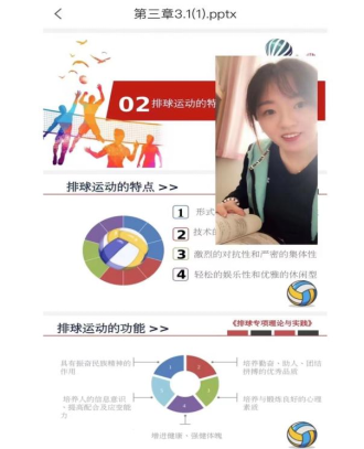 受疫情影响,本周开始,我与同学们隔空相见,上课的方式从体育馆中的“面对面”变成了电脑屏幕前的“面对面”。对于实践为主的技能课程,受场地和器材影响,线上教学的课程内容设计我也进行了相应调整,主要以排球基础理论知识的讲授为主,增强学生的专项身体素质为辅。并将课程思政与女排精神融入到线上课程之中,以提高学生排球技术和增强学生理论教学能力为主要目标,以室内体能锻炼为手段,着力提高学生专项素质,帮助学生舒缓心理压力、调整情绪。