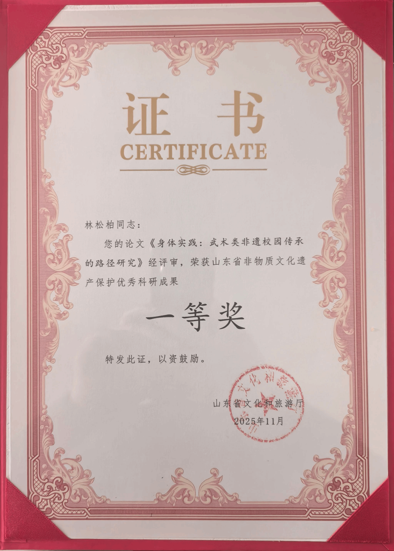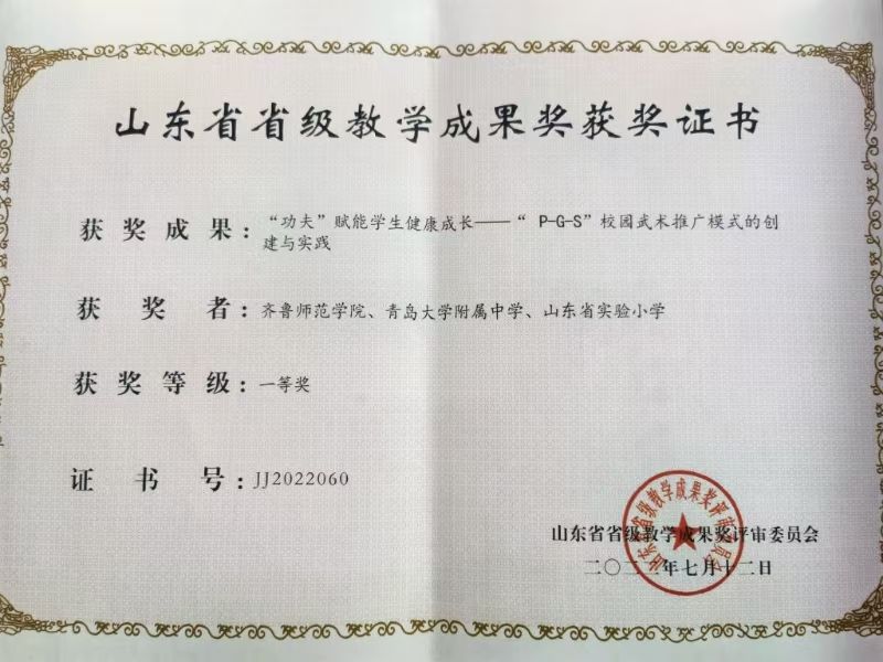 建成国家级非遗传承人工作室;构建P‑G‑S武术非遗校园传承模式,在全国多省市中小学推广;承担省校级课题,发表系列论文;研究成果获山东省非遗优秀科研成果一等奖;举办学术交流与非遗传承活动,形成“研究—教学—推广”一体化平台,获评省级“非遗进校园”优秀实践案例。